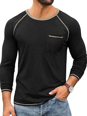 • Designs --- Our casual basic t shirt features contrasting neck, cuff and hem, crew neck, unique texture, raglan long sleeve, one chest pocket, regular fit style and distressed seams for a rugged look. Wear this T-shirt on its own or as a layering piece